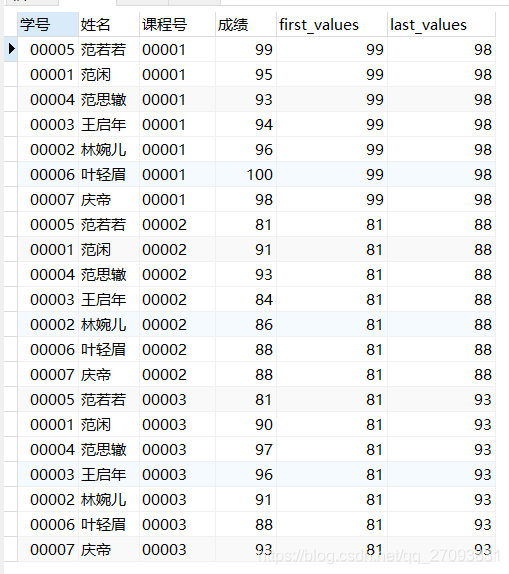 -- 按照课程号分区的第一个和最后一个成绩分数