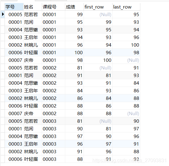 -- 按照课程号分区,成绩列每条记录的前一行lag()/后一行lead()