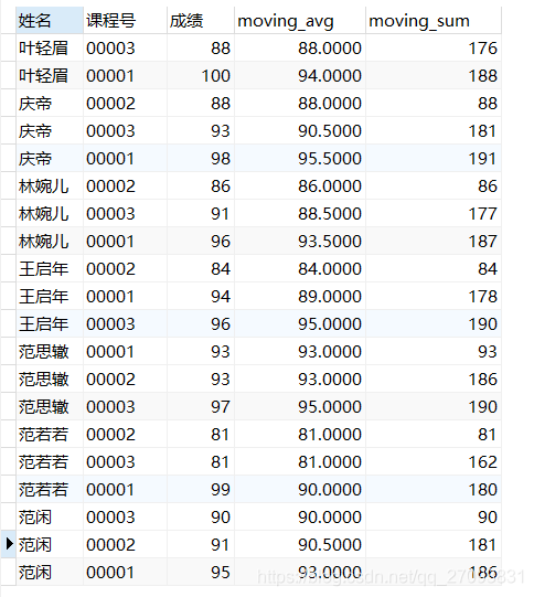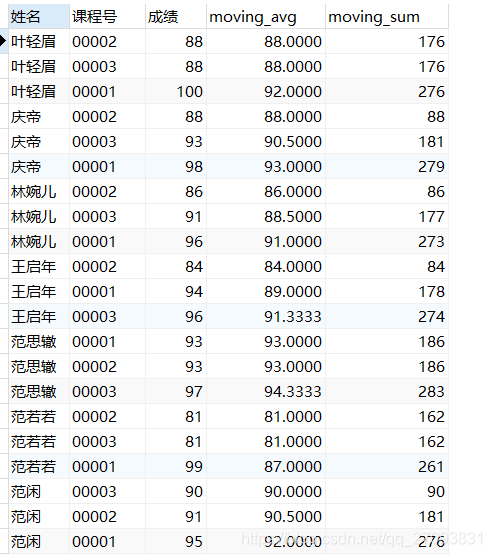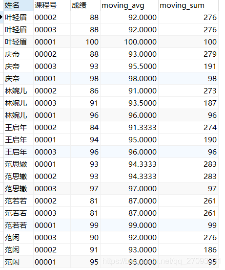 avg(成绩) OVER (PARTITION BY 姓名 ORDER BY 成绩 ASC ROWS 1 preceding) AS moving_avg,