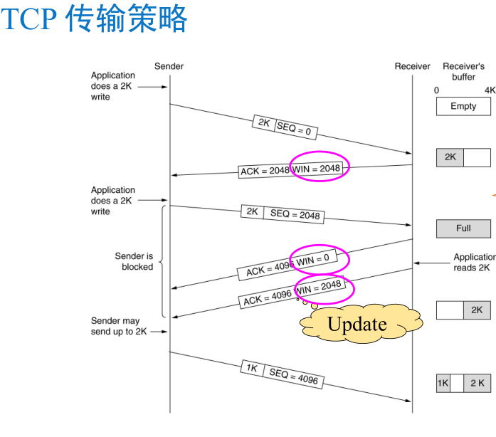 - TCP 传输策略:窗口尺寸受制于接收方,TCP适配收发双方的数据流量;当窗口数为 0 时,发送者不能正常发送数据段,除非Urgent数据。比如,用户想杀掉远端机器上的进程的时候,可以发送数据,发送者可以发送一个字节的数据段,以便让接收者再次发送期待接收的字节号和窗口数(避免死锁)
