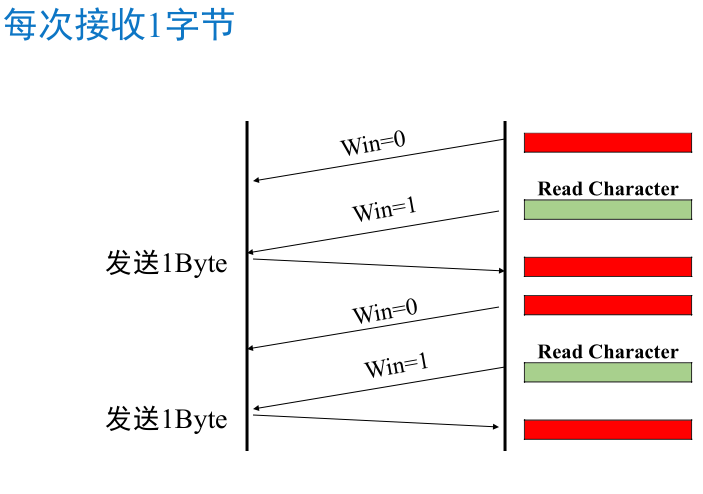 - 傻瓜窗口综合症(silly window syndrome problem):当有大块数据被传递给发送端TCP实体,但接收端的交互式应用每次只读取一个字节的时候,问题就来了