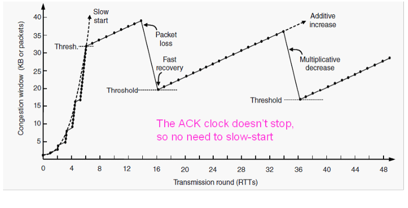 - 阈值:除了使用接收者窗口和拥塞窗口,TCP拥塞控制还是用了第三个参数,阈值(threshold),初始化为64K;当一个超时发生的时候,阈值降为当前拥塞窗口的一半,同时将拥塞窗口设为一个最大数据段的长度;使用慢启动算法来决定网络的容量,拥塞窗口增长到阈值时停止指数增长;从这个点开始,每次成功的传输都会让拥塞窗口线性增长(即每次仅增长一个最大的数据段长度)