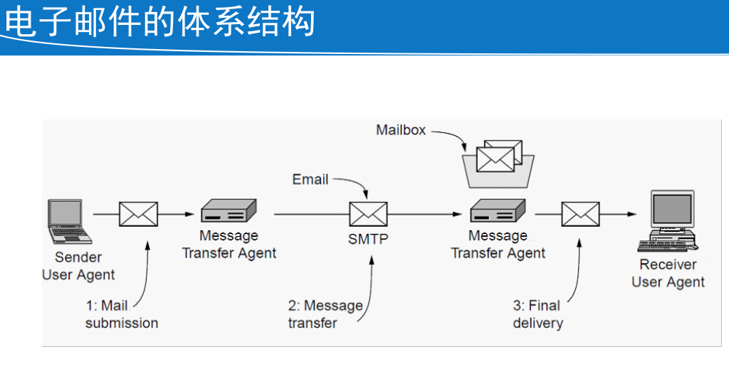 - 电子邮件 (email 伊妹儿)电子邮件系统通常由两部分组成:用户代理(UA):让用户能够阅读和发送邮件,本地程序,提供命令行或图形界面,让用户和电子邮件系统交互;消息传输代理 (MTA):将消息从源端送到目标端,通常是系统守护进程,即运行在后台的进程,在系统中传递电子邮件