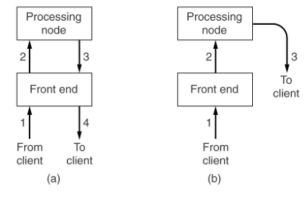 - 客户的TCP连接中止于前端,所以应答也必须经过前端 (a);一种解决的方法是TCP移交,TCP端点被传递给处理节点 ,所以应答可以直接向客户端发送 (b)