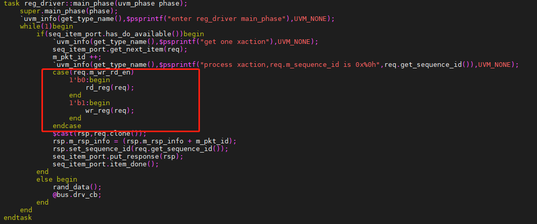 参考此函数调用关系,编写wr_reg/rd_reg的task,从而实现通过地址完成对寄存器的读写访问;读写时,首先借助uvm_create宏创建小action,然后在借助uvm_send宏将xaction发送出去;在读取寄存器时,需要注意的是返回的数据在xaction中返回.