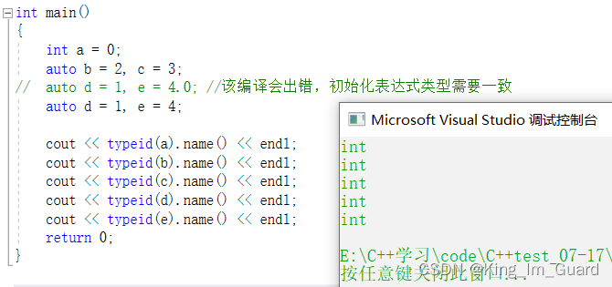 // auto d = 1, e = 4.0; //该编译会出错,初始化表达式类型需要一致