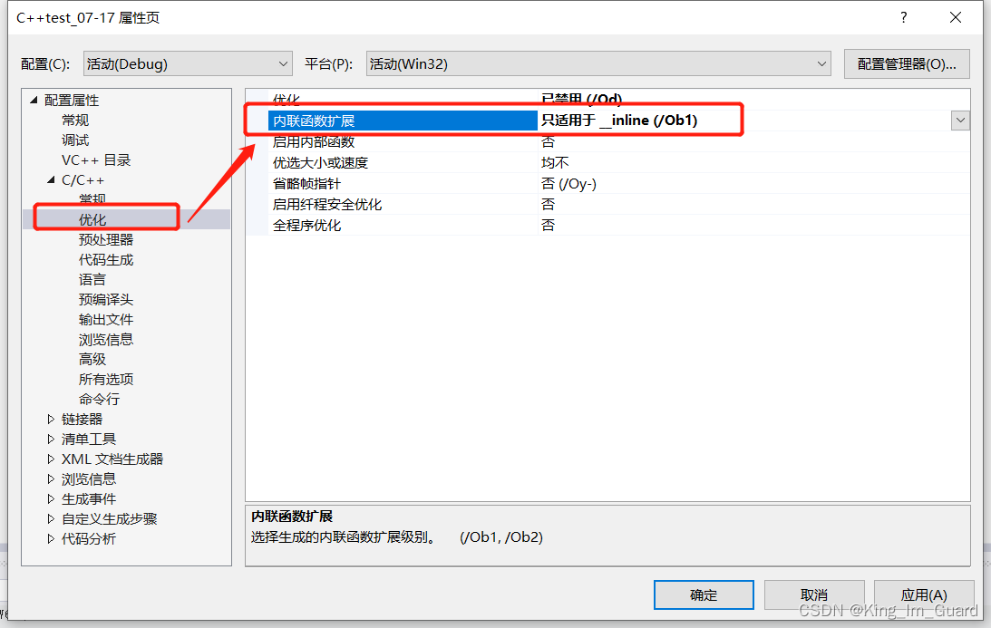 在分析内联函数的工作原理时,首先需要对VS编译器进行设置,首先需要确保在Debug模式下,因为在release条件下,可能会被系统优化,使得查看不了内联函数的效果,然后分以下三步骤进行设置即可。