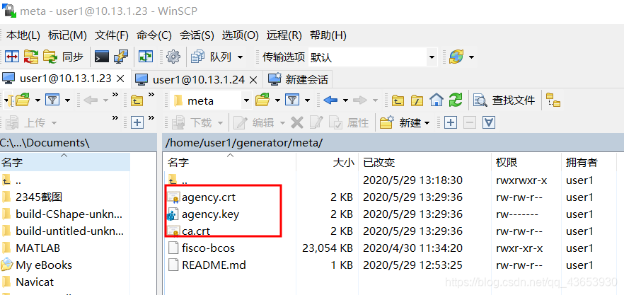 发送链证书、机构证书、机构私钥至机构A之后如果使用命令行查看的话还是比较麻烦的,但是通过WinSCP可以方便的看到我们刚才所下载安装的generator文件及链证书、机构证书、机构私钥,而不需要通过命令行的方式进行查看及一些文件复制等操作。