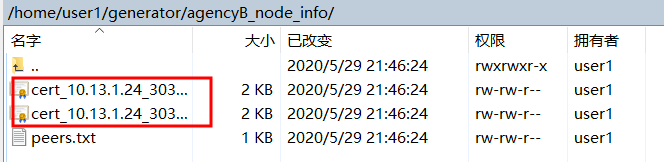 (1)将机构B节点agencyB_node_info 文件夹 cert_*.crt文件,如下两个文件,copy到机构A的meta文件夹中。