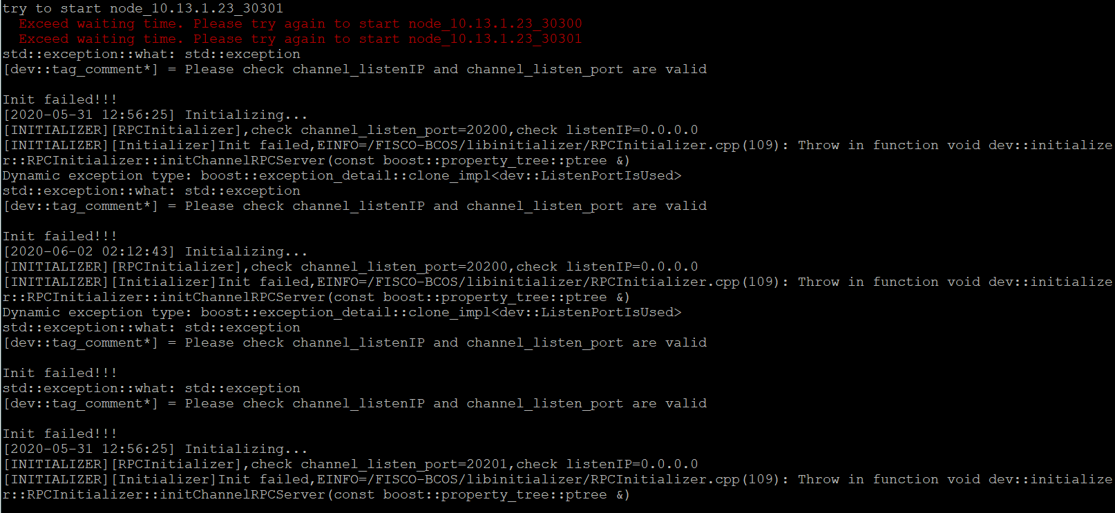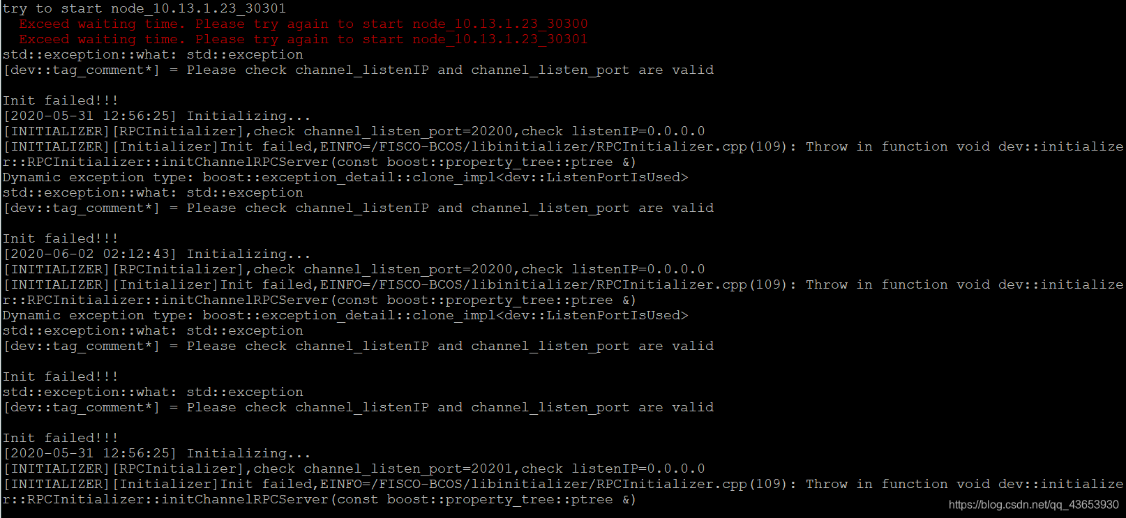 因为我们是root用户下的四个子用户,存在冲突,可尝试 ps -ef | grep fisco 查看进程节点 bash ./stop_all.sh 停掉其他节点,再启动就可以了。