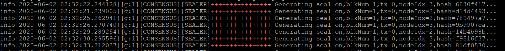 tail -f ./node*/node*/log/log* | grep +++查看到以下内容即为成功: