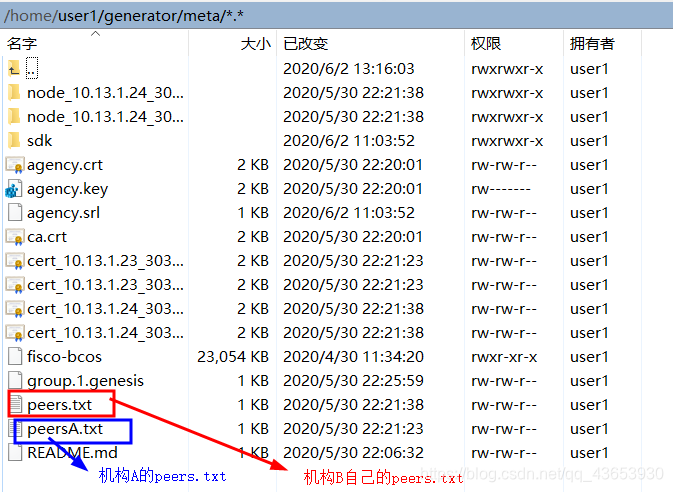 (1)将机构A中的 /generator/agencyA_node_info 文件夹下的 peers.txt 复制到自己的 /generator/meta 目录下,并且把peers.txt 的内容复制到机构B中meta新建一个peersA存放。