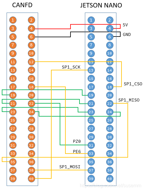 将CAN FD module的pwr/spi/int的pin连接到Nano,由于Nano的40pin和Raspberry Pi的不是一一对应的,没法直接把module叠加上去了。但是杜邦线可以带我们飞(飞线)啊。