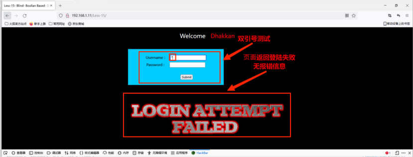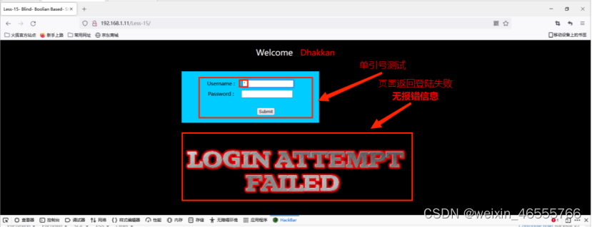 3. 在⽤户名中尝试输⼊单引号,⻚⾯返回登陆失败,双引号同样,没有任何数据库的报错信息。