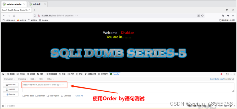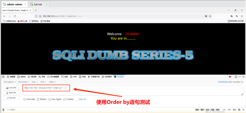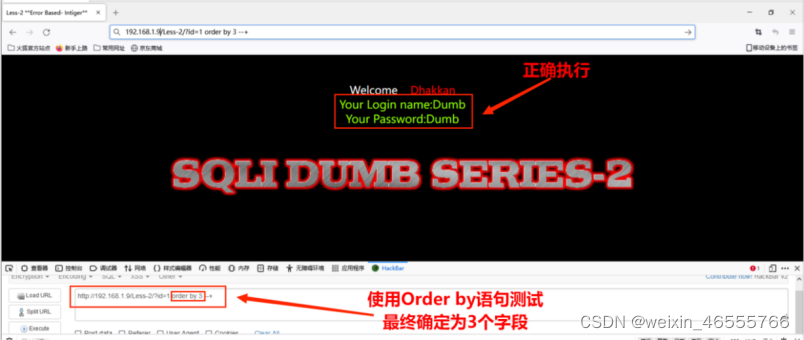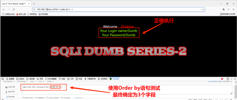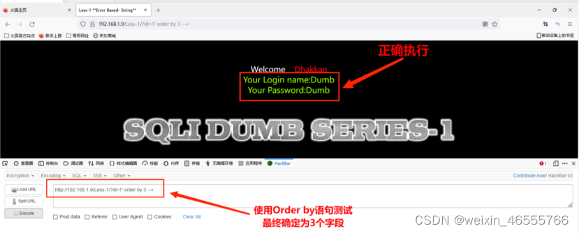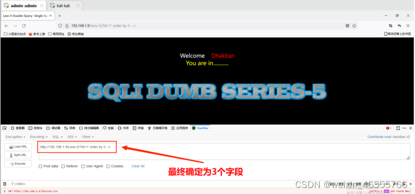 4. 使用Order by语句进行字段数量测试,通过二分法,最终发现可返回三个字段,其命令为:http://192.168.1.9/Less-1/?id=1' order by 3 --+