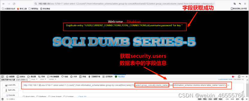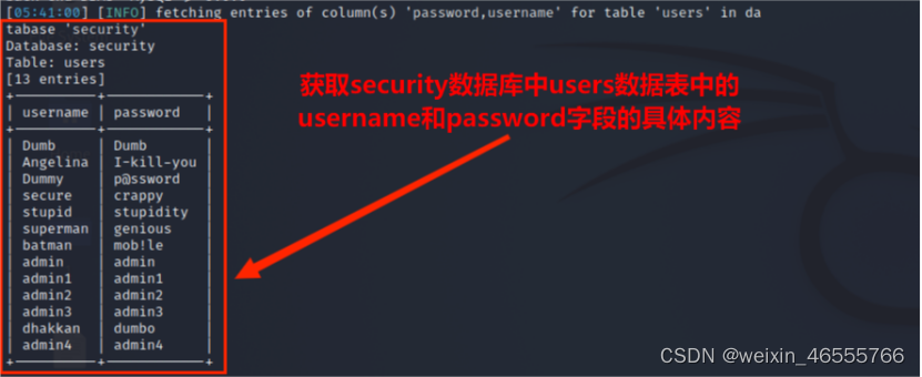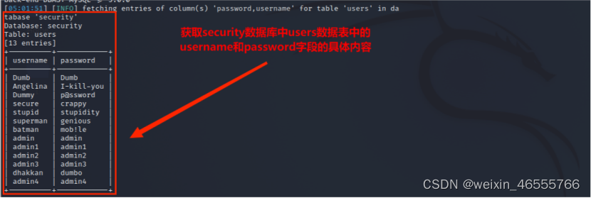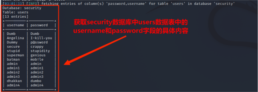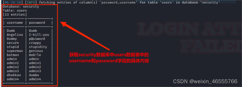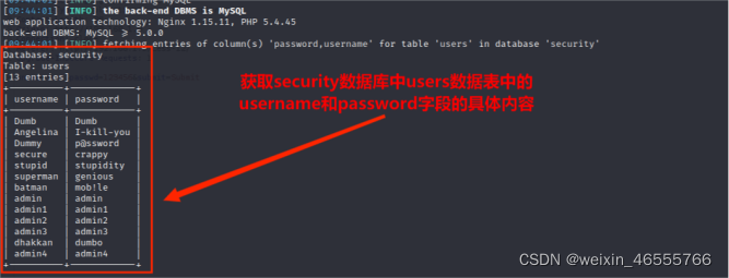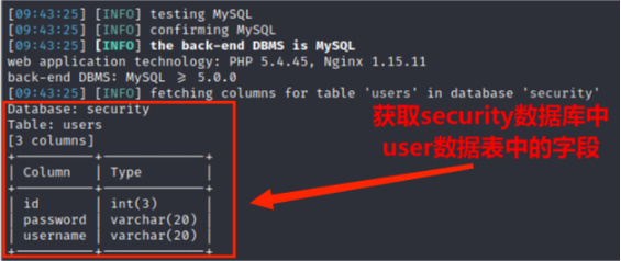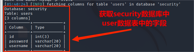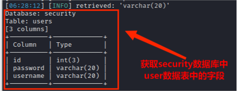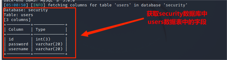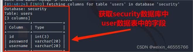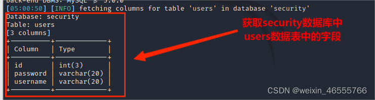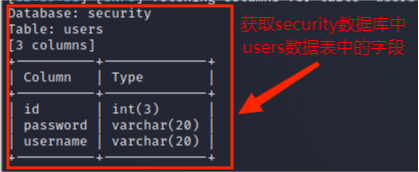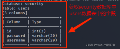 (5)从information.columns获取security.users数据表中的字段,包括 id,username,password信息字段,其命令为:
