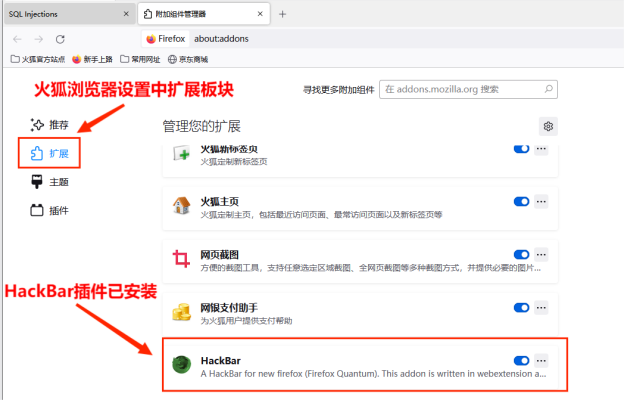1. 下载火狐浏览器,安装HackBar插件。