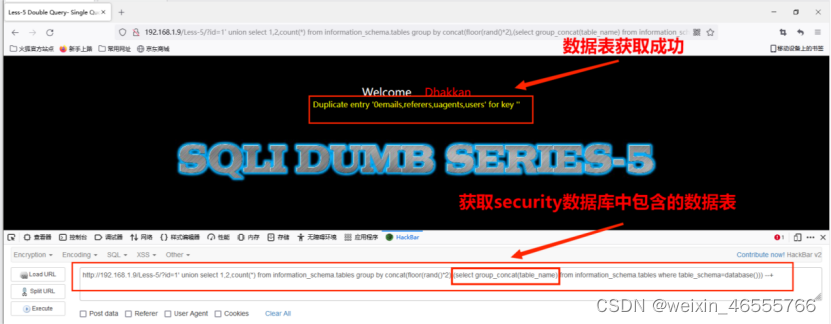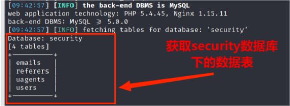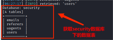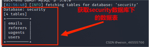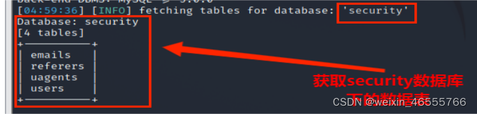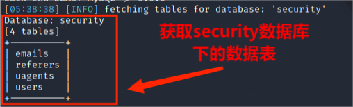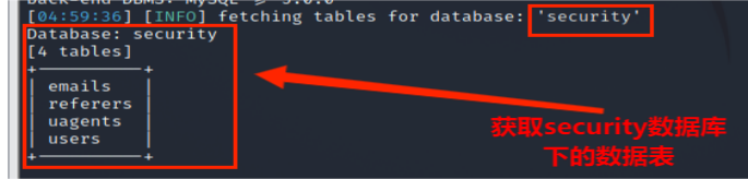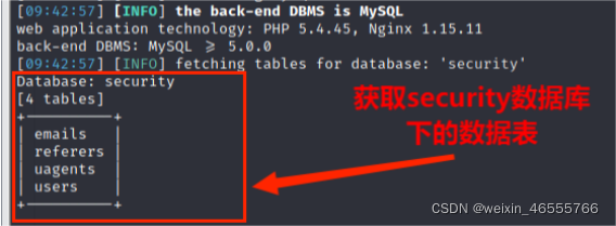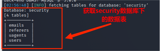 (4)从information_schema.tables获取数据库security数据库中的包含的数据表,包括 emails,referers,uagents,users 数据表,其命令为: