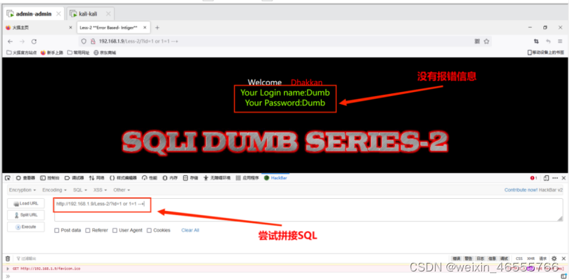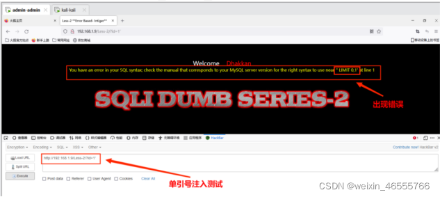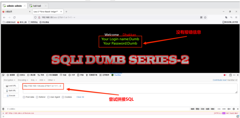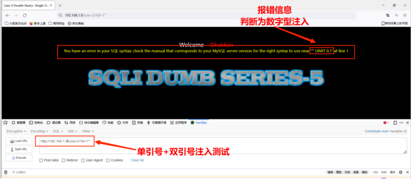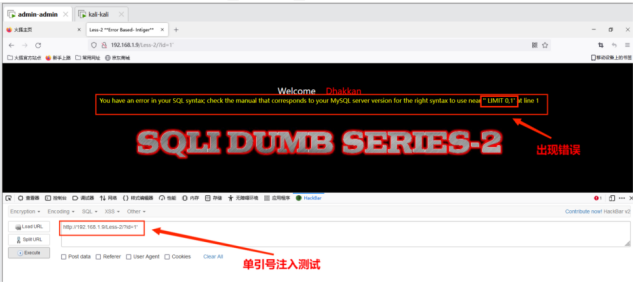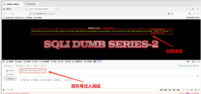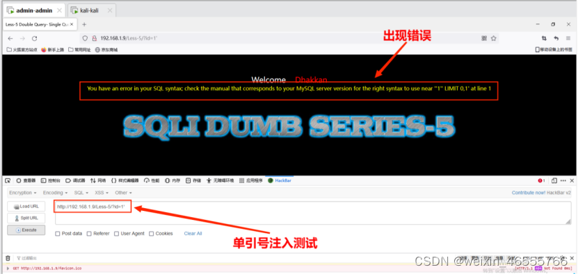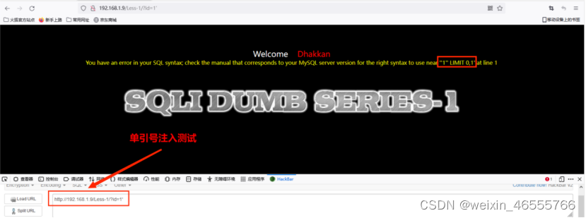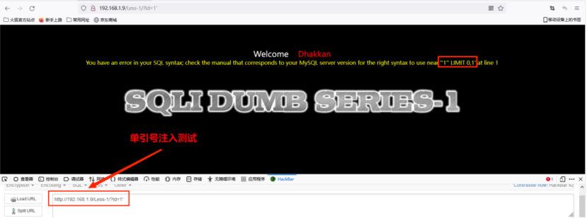 测试地址http://192.168.1.9/Less-1/?id=1' 出现错误提示,再次尝试http://192.168.1.9/Less-1/?id=1”发现可以正常访问,据此判断存在单引号字符型注⼊。