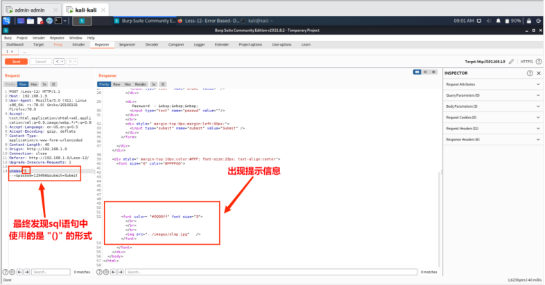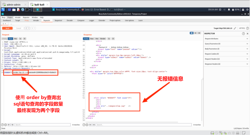 在本次实验中,针对不同类型的SQL注入漏洞,包括字符型、数字型、POST注入型、双注入、报错注入、布尔盲注,通过手工注入和SQLMap工具自动化注入两种注入方式进行注入测试。在手工注入测试中,通过利用HackBar插件和BurpSuite⼯具进行单引号、双引号、注释空格等基本测试,判断其存在各种类型的SQL注入漏洞,然后利用Order by和union语句构造sql语句获取数据库信息或者使用BurpSuite⼯具爆破数据库。在SQLMap工具自动化注入测试中,首先进行基本扫描,获取基本信息,发现其存在SQL注入漏洞,然后逐步解析数据库、数据表、字段信息、字段具体内容,最终破解密码。