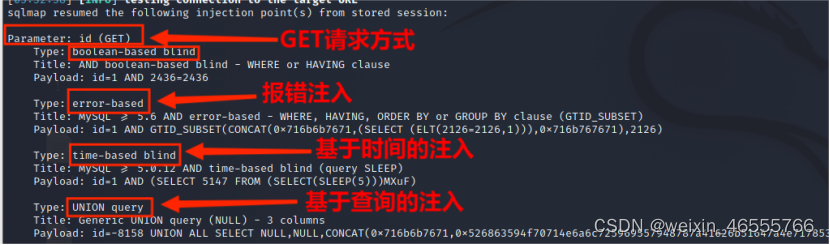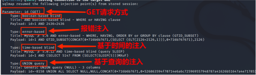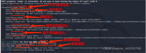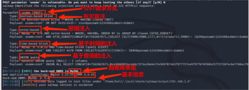 ●SQL注入类型包括SQL盲注、UNION注入、显错式注入、时间盲注、盲推理注入和堆查询注入等技术。