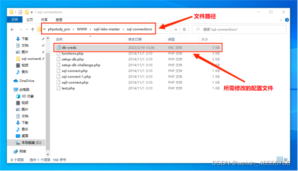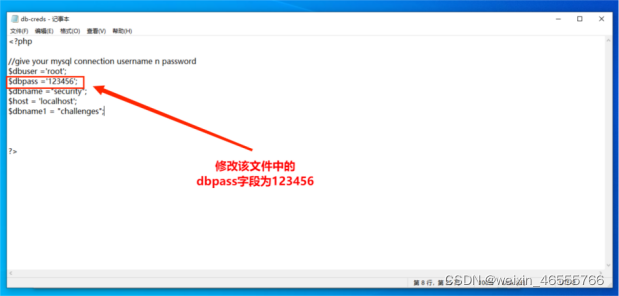 (4)通过C:\phpstudy_pro\WWW\sqli-labs-master\sql-connections路径,找到db-creds文件,将该文件中的dbpass字段修改为123456。