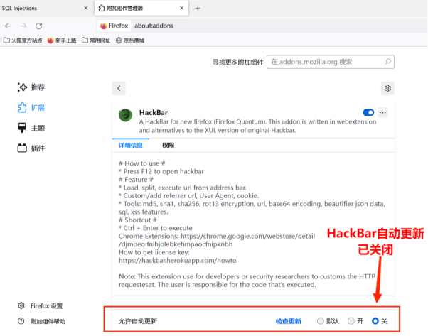 (3)关闭HackBar插件自动更新功能。