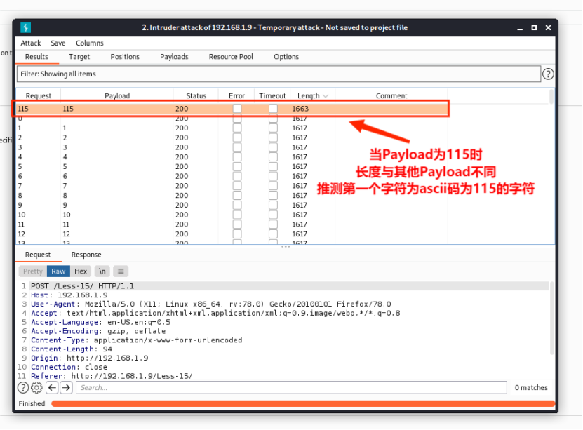(3)当Payload为115时,长度与其他Payload不同,推测第一个字符为ascii码为115的字符s。