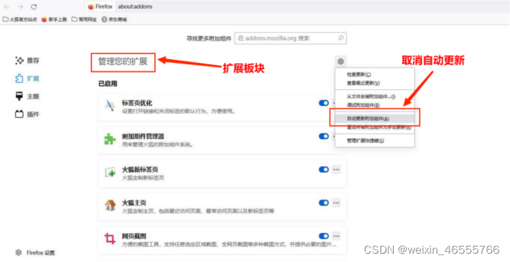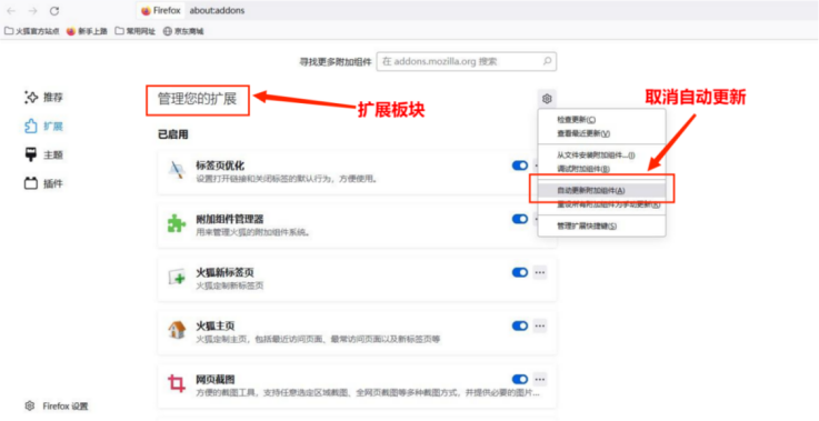 (1)下载火狐浏览器并取消扩展设置中的自动更新。