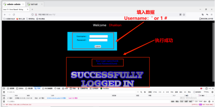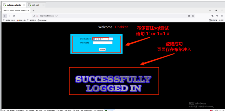 4. 尝试使⽤布尔盲注的sql测试语句 1' or 1=1 #发现登陆成功,⻚⾯存在布尔注⼊。