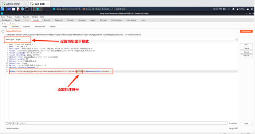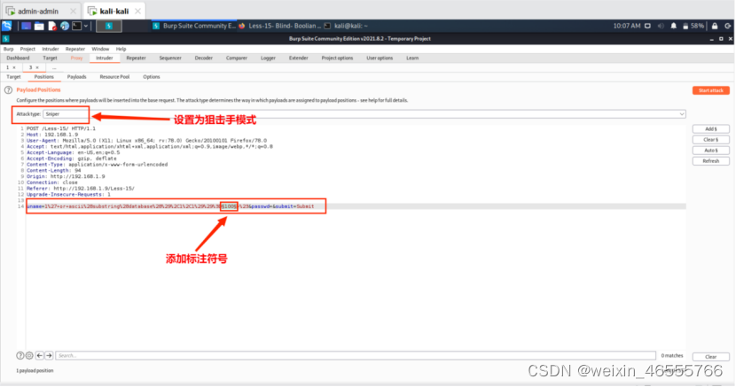 (1)将抓取的Post数据发送到Intruder并设置爆破模式为Sniper(狙击手)。