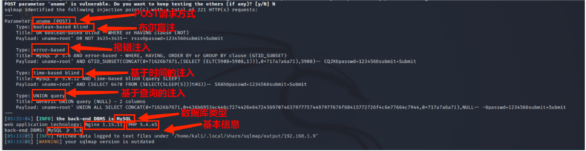 在本小节中,靶场开始界面为表单输入提交形式,通过手工注入和SQLMap工具自动化注入两种注入方式进行双注入测试。手工注入测试首先在输⼊框内输⼊⽤户名和密码、单引号、双引号,⻚⾯返回登陆失败,尝试使⽤布尔盲注的sql测试语句 1' or 1=1 # 发现登陆成功,⻚⾯存在布尔注⼊,则利用构造sql语句获取数据库信息,同时使⽤BurpSuite爆破数据库,最终获得数据库的第⼀个字⺟为s。SQLMap工具自动化注入首先进行基本扫描,获取基本信息,发现其存在SQL注入漏洞,然后逐步解析数据库、数据表、字段信息、字段具体内容,最终破解密码。