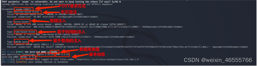 在此次SQL注入环境搭建和多种注入类型测试实验中,通过手工注入和SQLMap工具自动化注入两种注入方式对不同类型的SQL注入漏洞进行测试,掌握了HackBar插件的用法和SQL漏洞基本测试技巧,回顾了Burp Suite工具和SQLMap工具的基本用法,对SQL注入漏洞的类型、测试、解析有了更为深刻的理解。