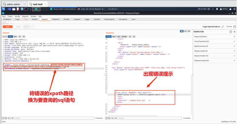 在本小节中,靶场开始界面为表单输入提交形式,通过手工注入和SQLMap工具自动化注入两种注入方式进行双注入测试。手工注入测试利用BurpSuite工具进行抓包,然后使用Order by语句进行字段数量测试,通过使⽤union联合查询,在查询的sql语句中分别使⽤ extractvlaue,updatexml两个函数的错误提示功能,构造select查询语句以实现读取数据库信息。SQLMap工具自动化注入首先进行基本扫描,获取基本信息,发现其存在SQL注入漏洞,然后逐步解析数据库、数据表、字段信息、字段具体内容,最终破解密码。