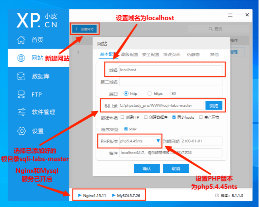 (2)开启Nginx和Mysql服务并新建网站,设置域名为localhost,选择已添加好的根目录sqli-labs-master,设置PHP版本为php5.4.45nts。