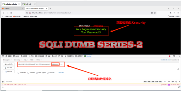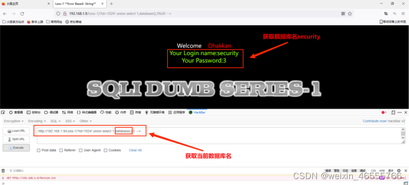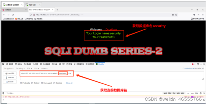 (2)获取当前数据库名:只有union前⾯的语句不执⾏,后⾯的语句才能执⾏,其命令为:
