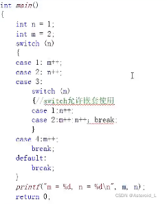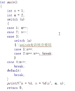例子:输出星期几 int main() { int day=0; scanf("%d",&day); switch(day) { case 1: printf("星期一\n"); break; case 2: printf("星期二\n"); break; case 3: printf("星期三\n"); break; case 4: printf("星期四\n"); break; case 5: printf("星期五\n"); break; case 6: printf("星期六\n"); break; case 7: printf("星期天\n"); break; default: printf("输入错误\n"); break; } return 0; }输出休息日和工作日 int main() { int day=0; scanf("%d",&day); switch(day) { case 1: case 2: case 3: case 4: case 5: printf("工作日\n"); break; case 6: case 7: printf("休息日\n"); break; } return 0; }- 例题 m、n结果是?5、3