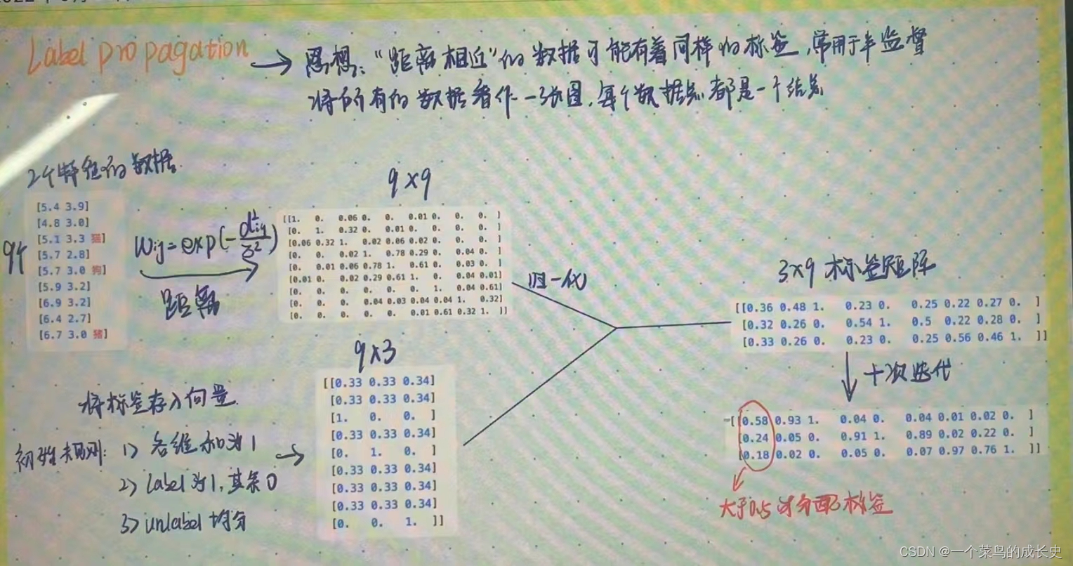 1.标签传播算法是基于图的半监督学习方法,基本思路是从已标记的节点的标签信息来预测未标记的节点的标签信息,利用样本间的关系,建立完全图模型。