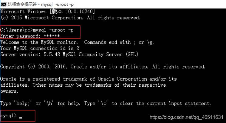 命令:mysql -uroot -p(登陆密码)
