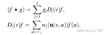 除了空间方法的不同变体之外,还提出了几个通用框架,旨在将不同的模型集成到一个框架中。混合模型网络(MoNet)是一个试图统一非欧几里德域模型的空间框架,包括用于流形(流形学习的观点是认为,我们所能观察到的数据实际上是由一个低维流形映射到高维空间上的,即这些数据所在的空间是“嵌入在高维空间的低维流形。”。由于数据内部特征的限制,一些高维中的数据会产生维度上的冗余,实际上只需要比较低的维度就能唯一地表示。在极坐标的表示方法下,圆心在原点的圆,只需要一个参数就能确定:半径。当你连续改变半径的大小,就能产生连续不断的“能被转换成二维坐标表示”的圆。所以说,实际上二维空间中的圆就是一个一维流形。)的CNN和GNN(including CNNs for manifold and GNNs)。GCNN,ACNN,DCNN可以表述为MoNet的特殊实例。在MoNet中,流形上的每个点或图上的每个顶点,都用v表示,都被视为伪坐标系的原点。邻居 u 与伪坐标 u(v,u) 相关联。给定两个函数 f,g 定义在图的顶点(或流形上的点)上,MoNet 中的卷积算子定义为: