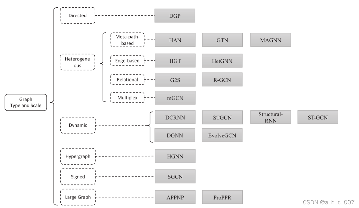 在找到图结构后,我们必须找到图的类型和它的范围。复杂类型的图可以提供有关节点及边的更多信息。图的类型包括①有向图和无向图,有向图中的边都是由一个结点指向另一个节点,无向图中的每条边也可以看成两条有向边;②同构图和异构图,同构图中,节点的种类只有一种,一个node和另一个node的连接关系只有一种,异构图是包含不同类型节点和边的图;③动态和静态图,当输入特征和图的拓扑结构随时间变化时,该图被视为一个动态图,在动态图中应该考虑时间信息。这些类型可以组合,譬如可以处理动态有向异构图。当设备无法存储和处理图的邻接矩阵或图拉普拉斯算子时,我们讲图视为大规模图,考虑一些采样方法。
