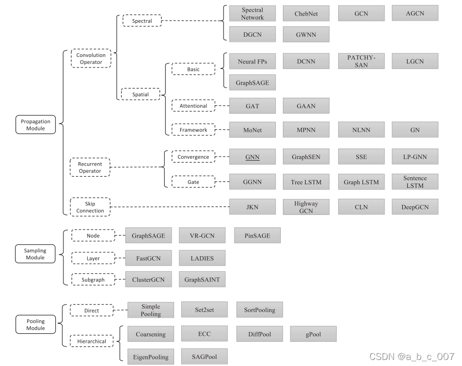 传播模块用于在节点之间传播信息,以便聚合信息能够捕获特征和拓扑信息。在传播模块中,卷积算子和循环算子通常用于聚合来自邻居的信息,而跳跃连接操作用于从节点的历史表示中收集信息并缓解过度平滑问题。当图很大时,通常需要采样模块,采样模块通常和传播模块一起使用。当我们需要高级子图或图的表示时,需要池化模块来从节点中提取信息。