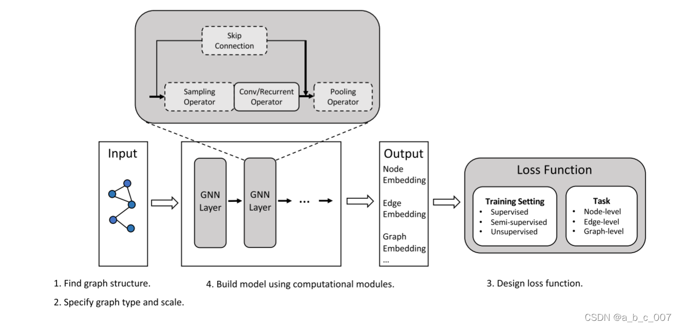 对于图学习任务,通常有三种。节点级任务侧重于节点,包括节点分类,节点回归,节点聚类等。节点分类试图将节点分为若干类,节点回归预测节点的连续值,节点聚类旨在将将节点划分为几个不相交的组,其中相似节点在一组。边级任务是边分类和链路预测,这需要模型对边类型进行分类或者预测给定的两个节点间是否存在链路。图级任务包括图分类,图回归和图匹配,所有的这些任务都需要模型来学习图表示。通过任务类型和训练设置,我们可以为任务设计特定的损失函数。例如,对于节点级半监督分类任务,可以将交叉熵损失用于训练集中的标记节点。